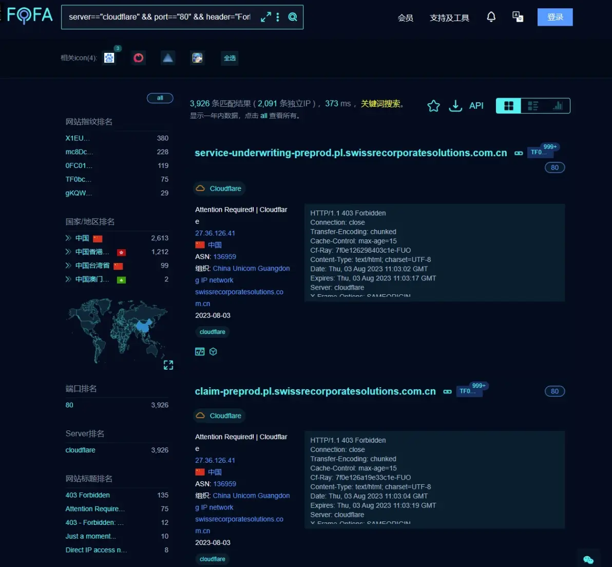 server=="cloudflare" && port=="80" && header="Forbidden" && country=="CN"
