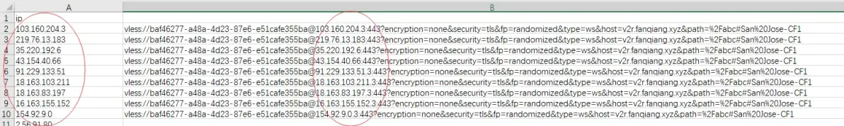 下载搜索到的ip,用excel打开,这时先到客户端复制一下节点链接,如果是ip+域名的形式,可以直接复制,否则需要做一些调整,如图所示。
