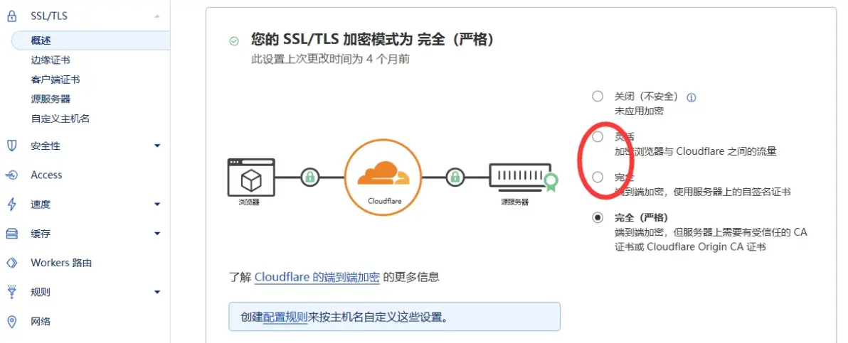 接着,我们在SSL/TLS设置页面,将加密模式改成灵活或者完全。