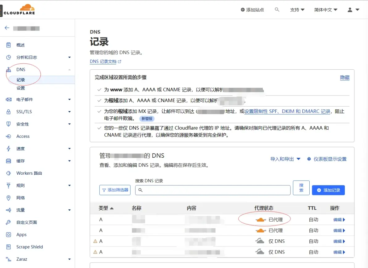 首先,你需要搭建一个vless+ws+tls的节点,并将域名托管到CF。节点搭建好后,我们来到CF的配置页面,找到DNS记录选项,启用DNS代理,小云朵变成橙色则表示我们正在使用CF的CDN服务,这时可以ping我们的域名,当IP地址从原始IP变更为CF 的IP时,则表示已经成功启动CF的CDN服务了。